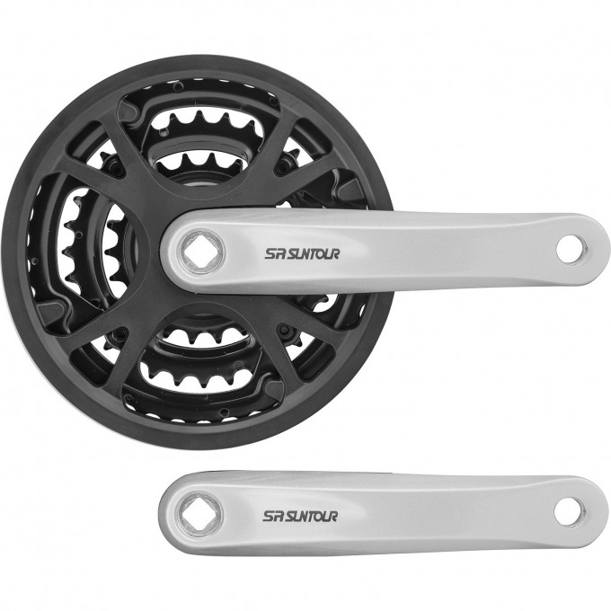 Система шатунов CW-XCC-T202GNIBG SR Suntour, звёзды на 22/32/42 зуба стальные чёрные, шатуны 170 мм алюминиевые серебристые, крепление под ромб, защита цепи пластиковая ПВХ чёрная, линия цепи 48 мм (для оси 122 мм)